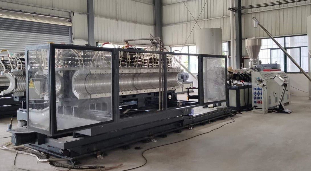 Extrudeuse : La boudineuse à vis simple de grande vitesse et d'efficacité est particulièrement conçue pour pour expulser matériel de PE. Baril cannelé, équipé du réducteur de fan, à grande vitesse et dur plus à faible bruit de vitesse. Les couches intérieures et externes du tuyau ondulé sont indépendamment alimentées le matériel par deux extrudeuses. Il peut faire l'intérieur et les couches externes produisent l'extrusion différente de rendement élevé de matériel et de garantie.